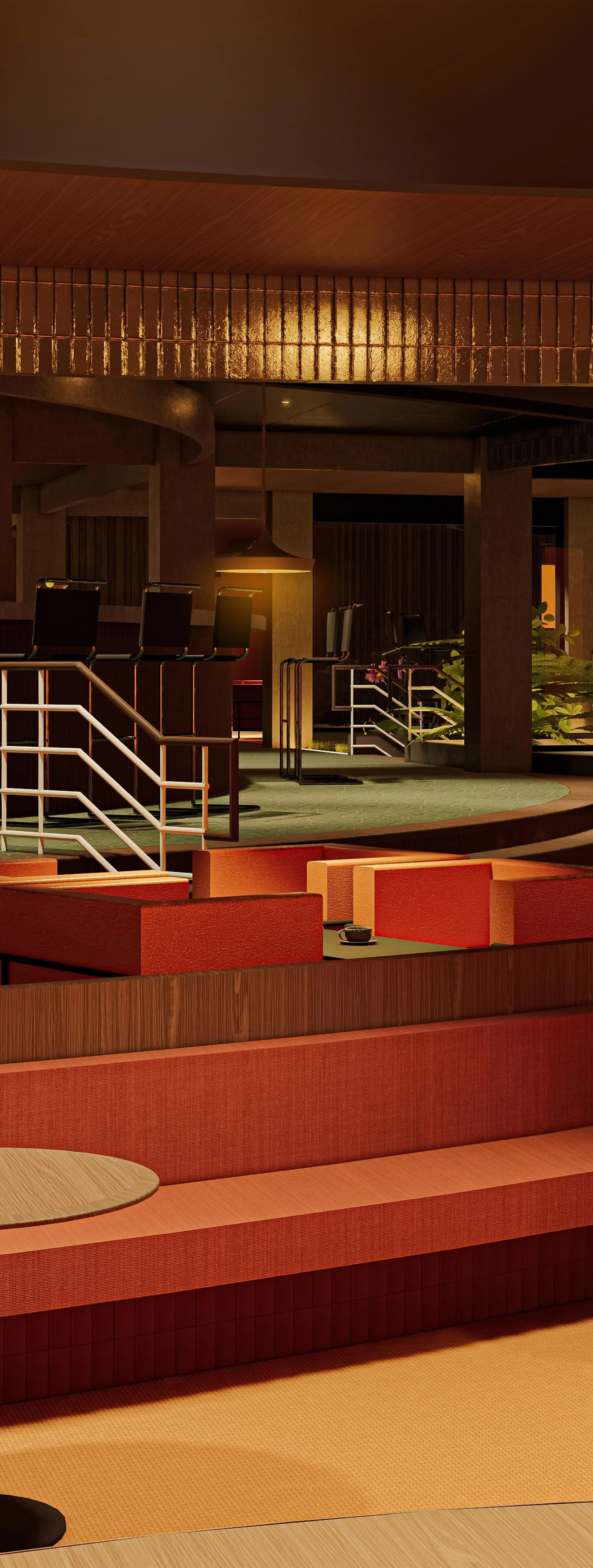 An indoor sanctuary where the warmth of a hearth, the intimacy of a bar, and the calm of a woodland theatre converge. Timber-clad walls, dappled light, and organic textures create an immersive “third space,” guiding guests through ritual and narrative, where every detail shapes the experience.