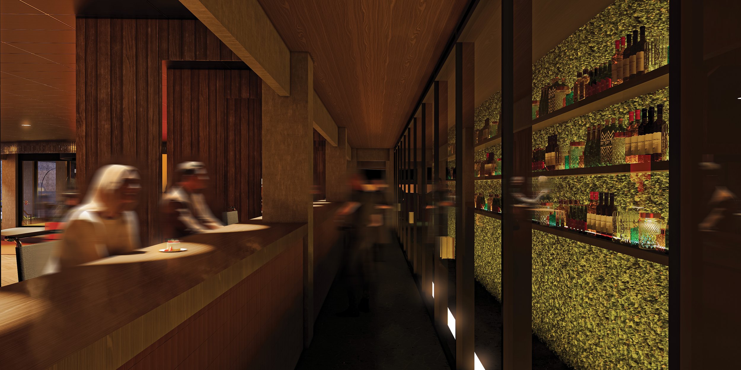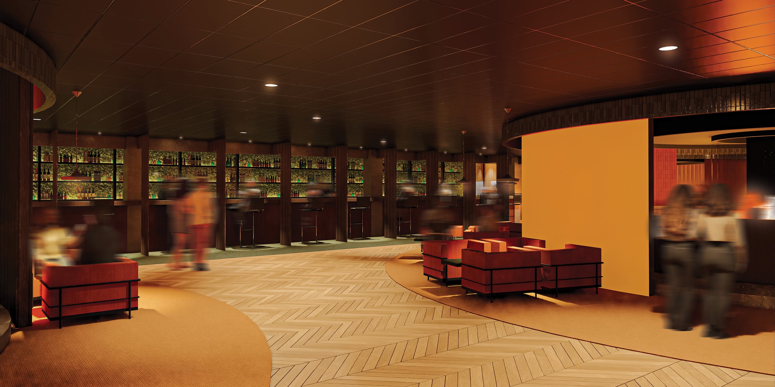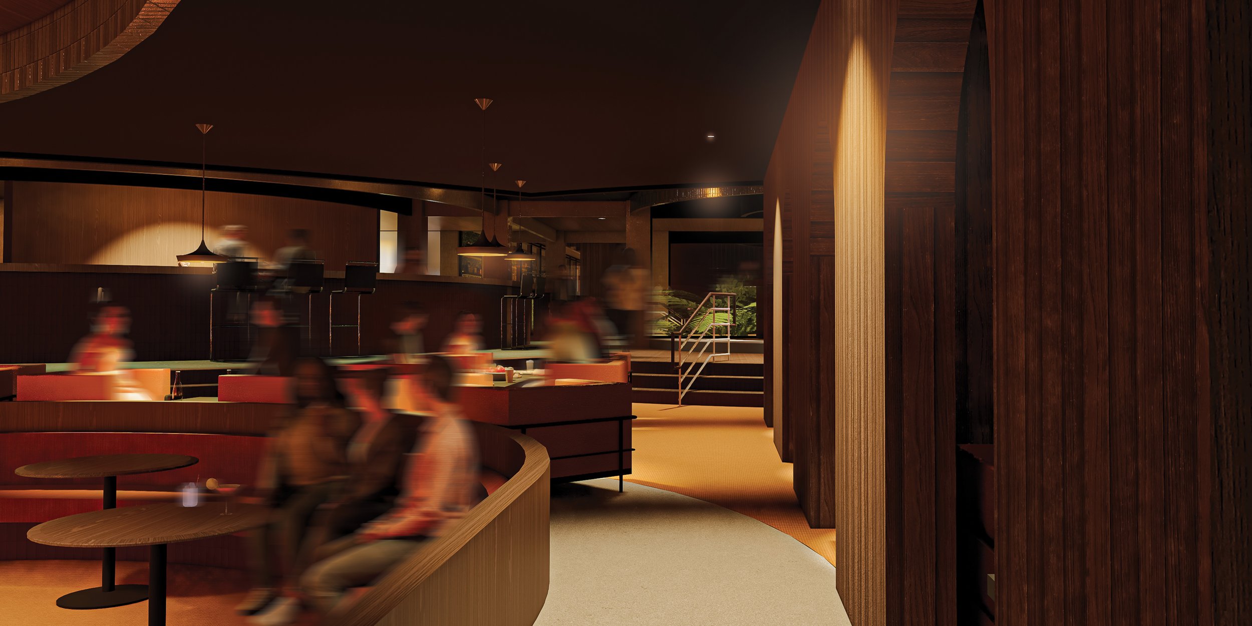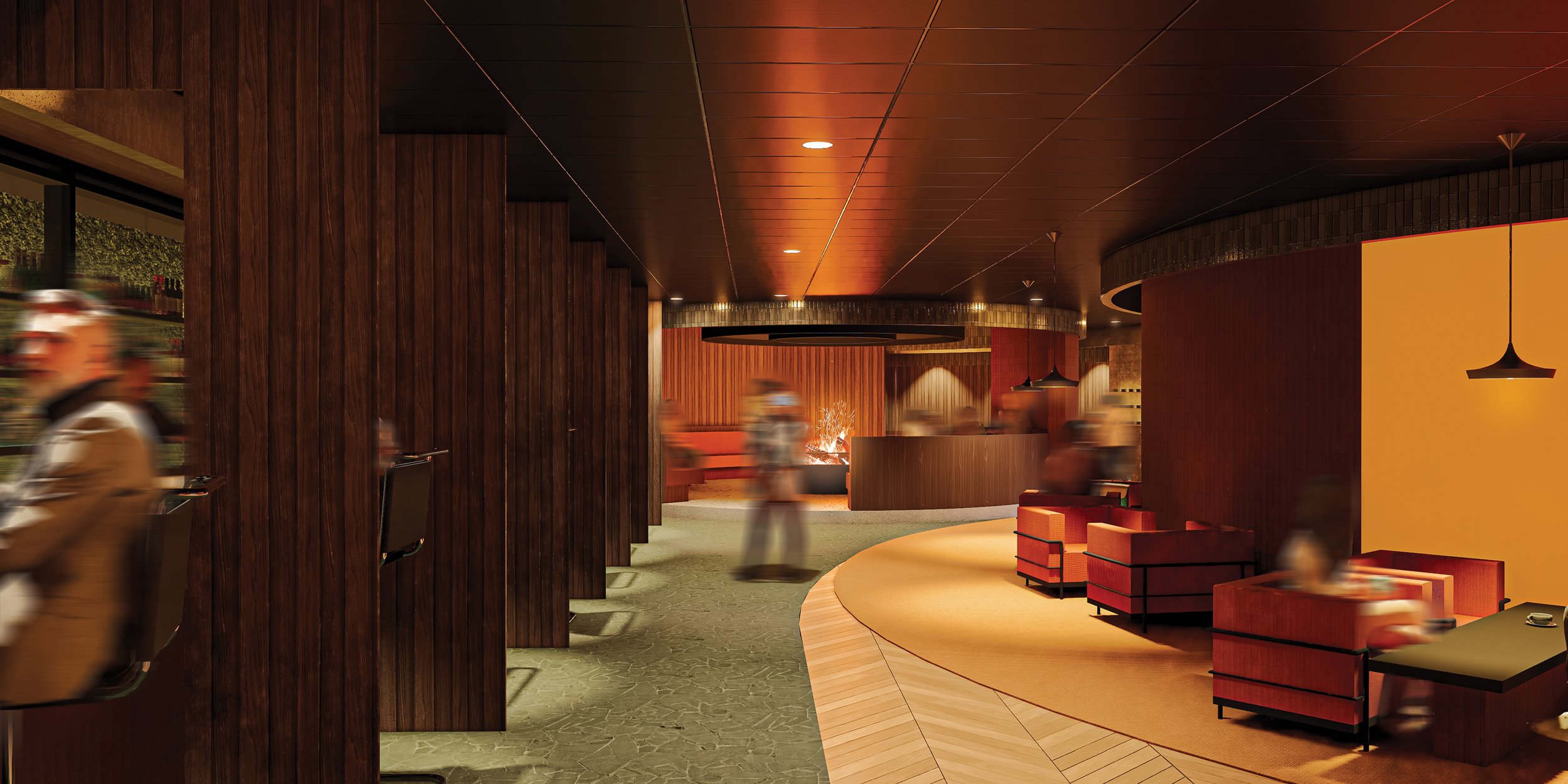 A bespoke bar counter and cosy theatre alcove further enrich the experience, encouraging communal interaction around the warmth of the fire while ensuring individual comfort. Through careful modulation of seating density, material expression, and light, the design cultivates an immersive, emotionally engaging environment that echoes the communal spirit of camping in a refined, luxury setting.