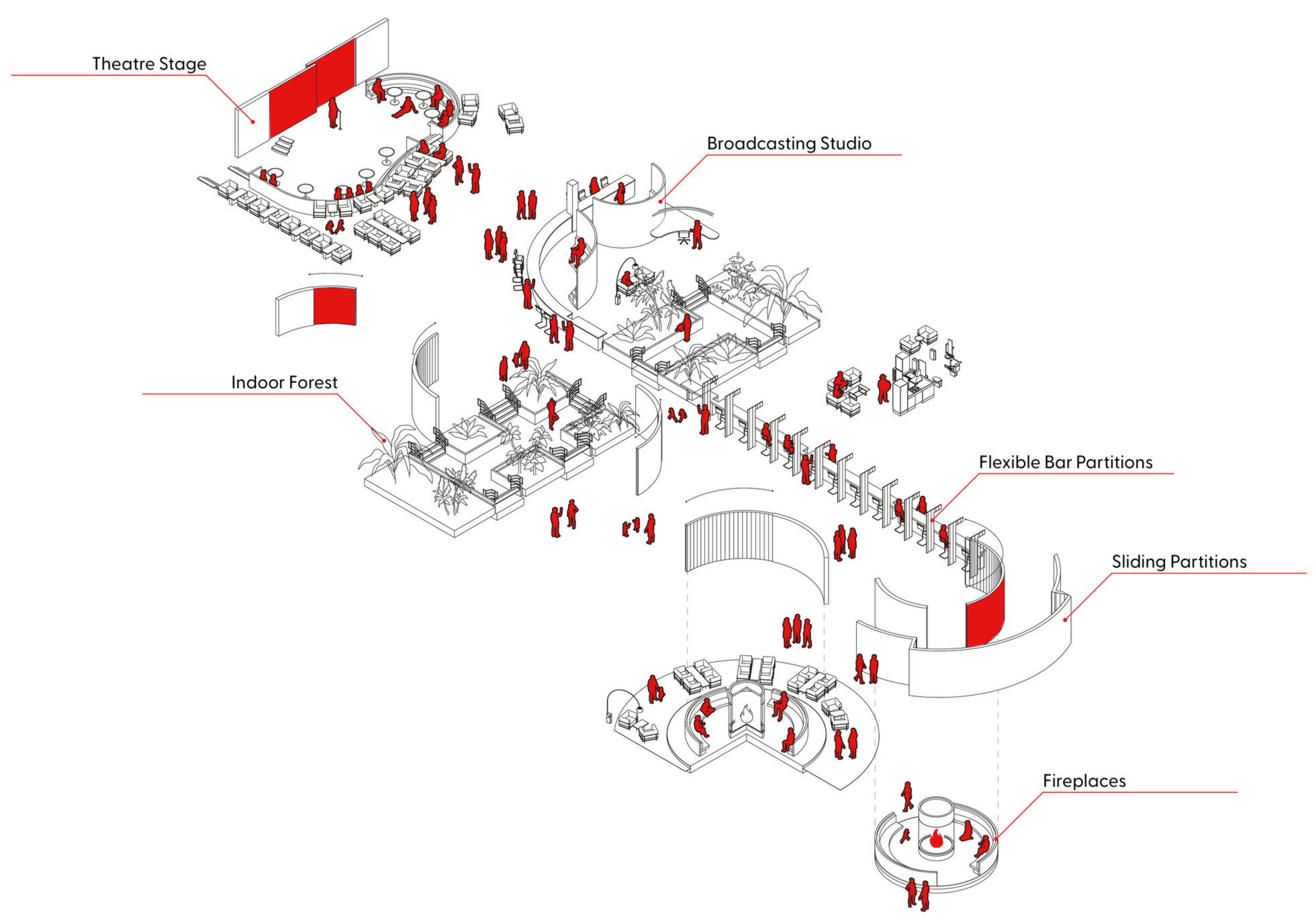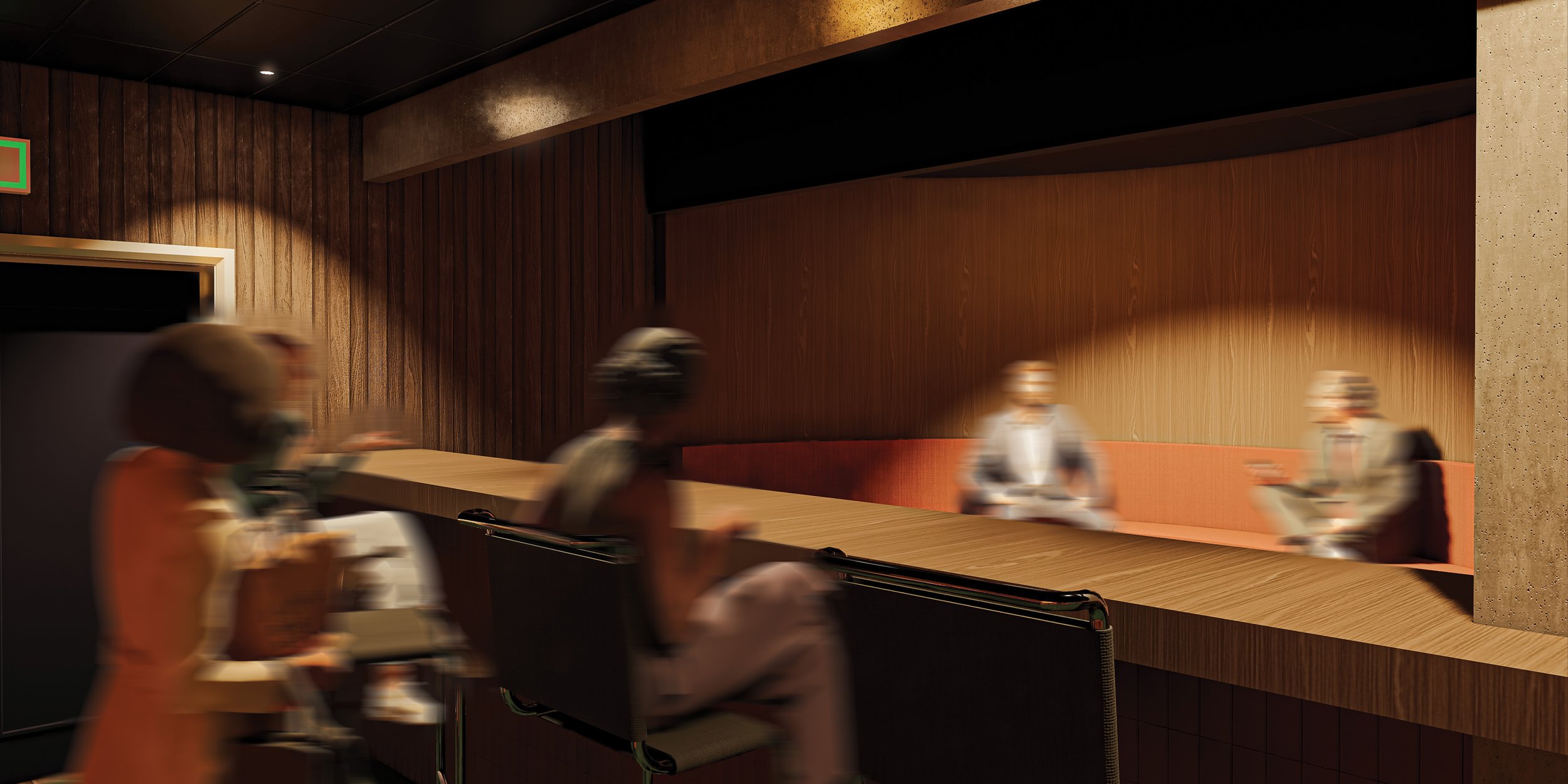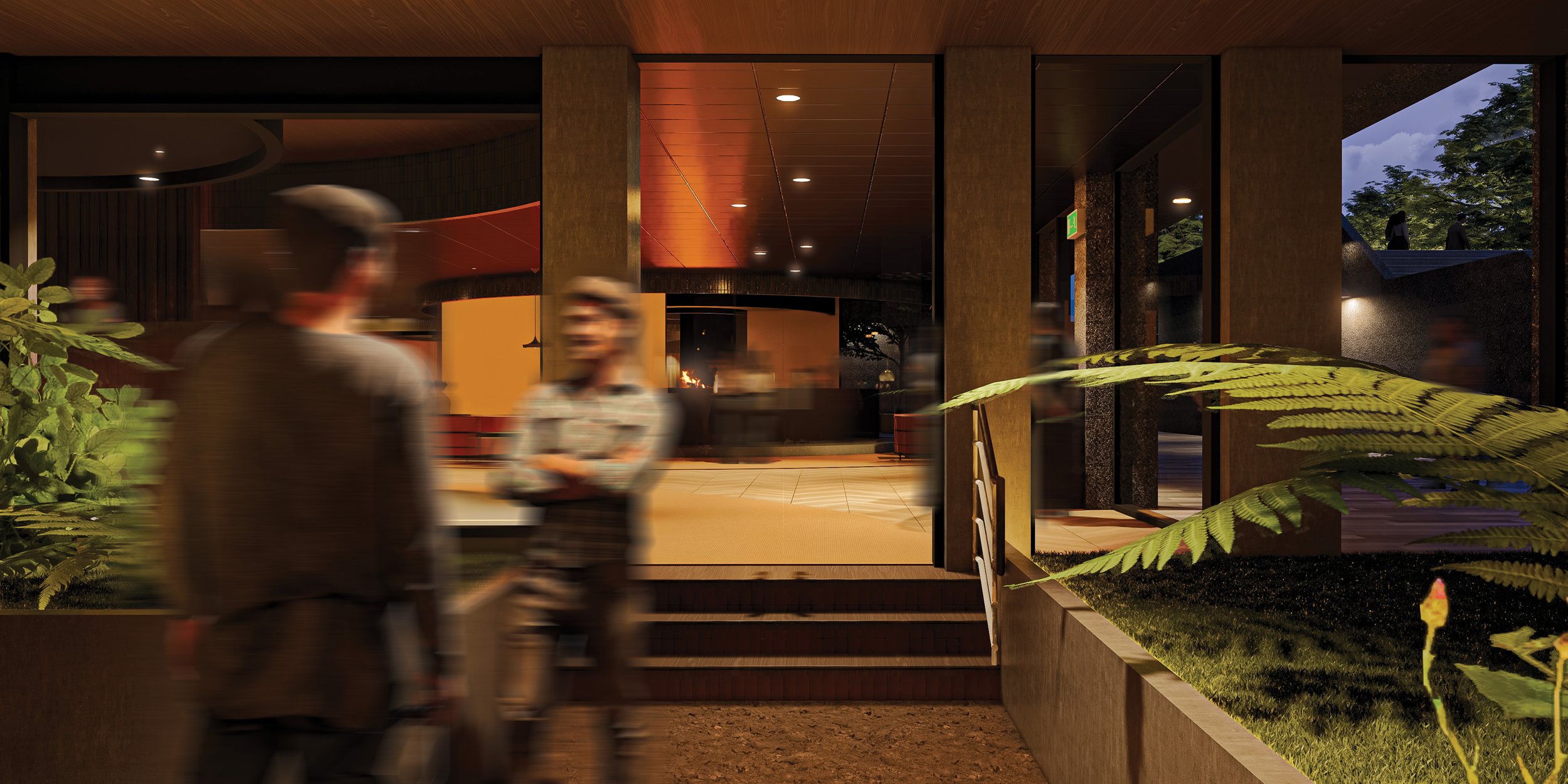Drawing inspiration from the ritual of camping, Escape It reimagines the hospitality lounge as a convergence of hearth, forest, bar, and theatre. Grounded in proxemic theory, the project investigates how spatial proximity shapes the atmosphere of social gatherings, particularly around an indoor fireplace. Seating is arranged to balance intimate, personal, and social distances, using timber-clad benches, moss-textured upholsteries, and soft, dappled lighting to define distinct zones.